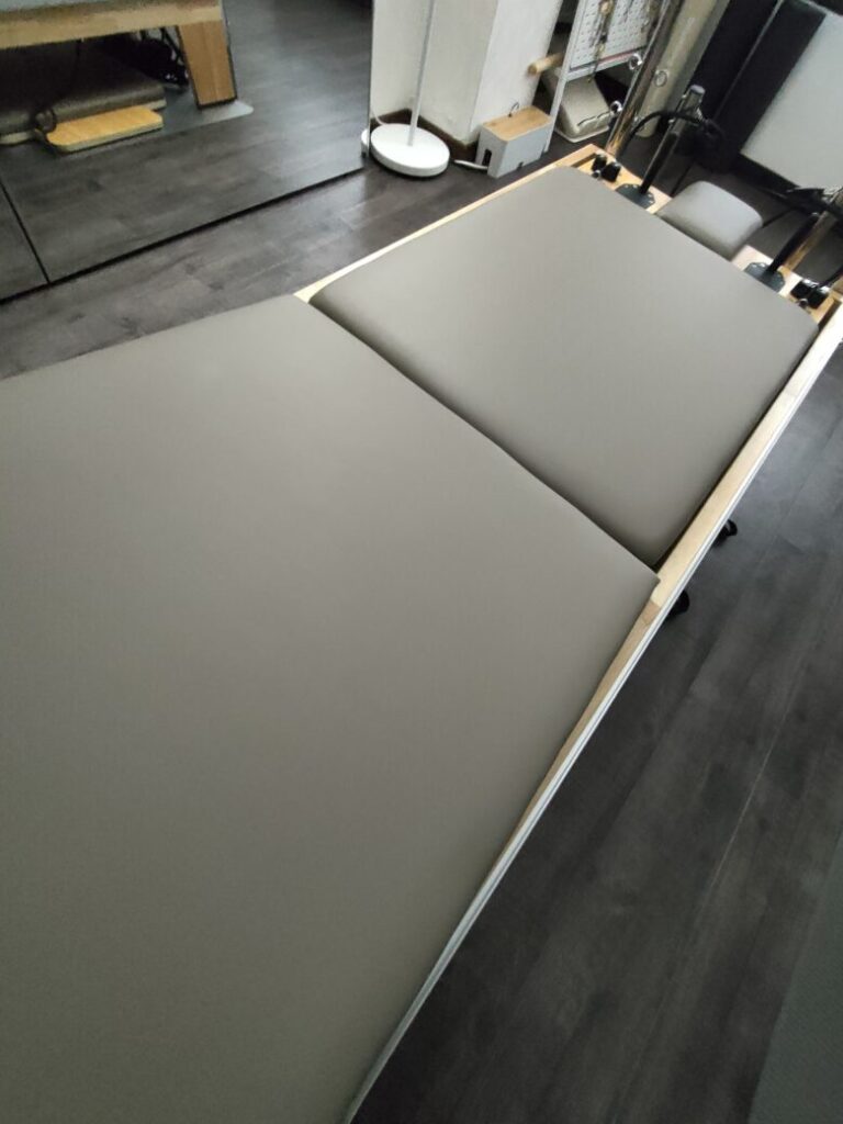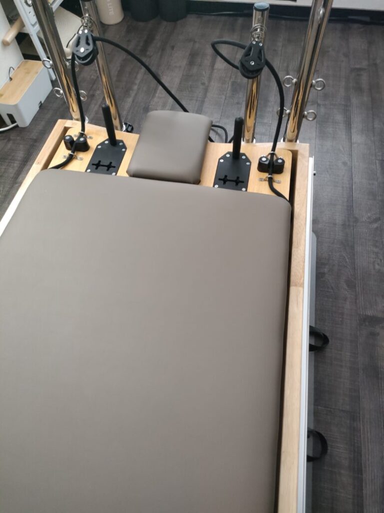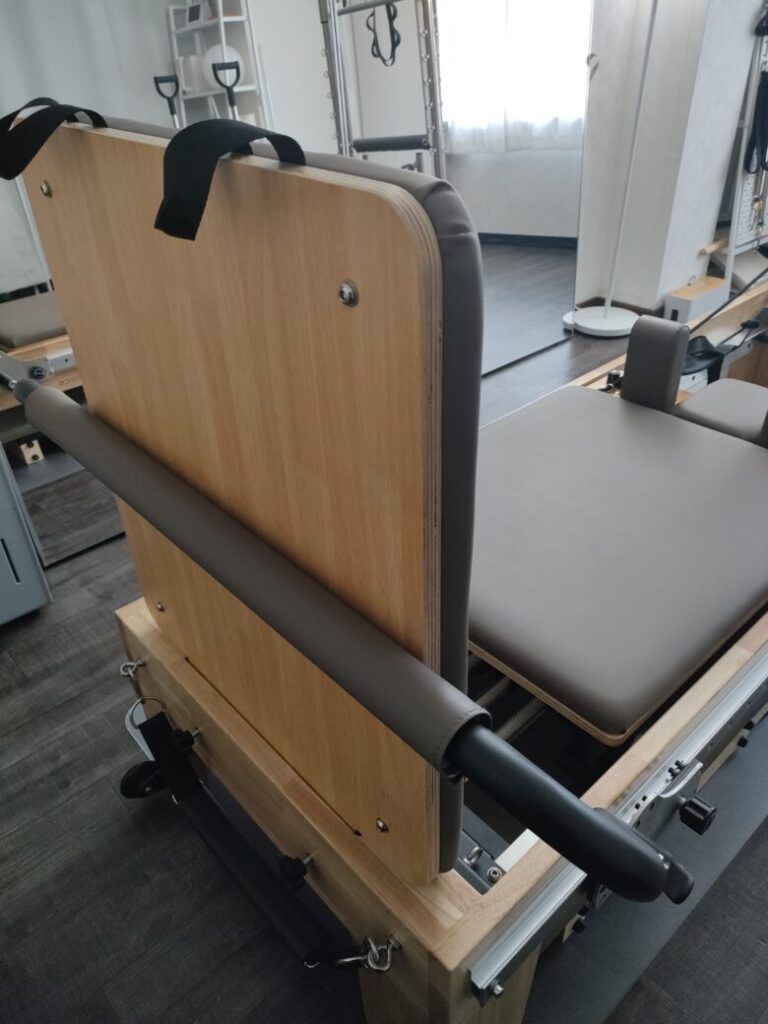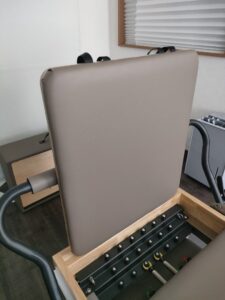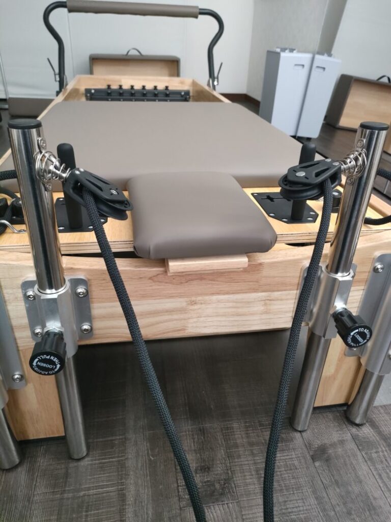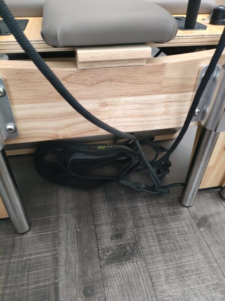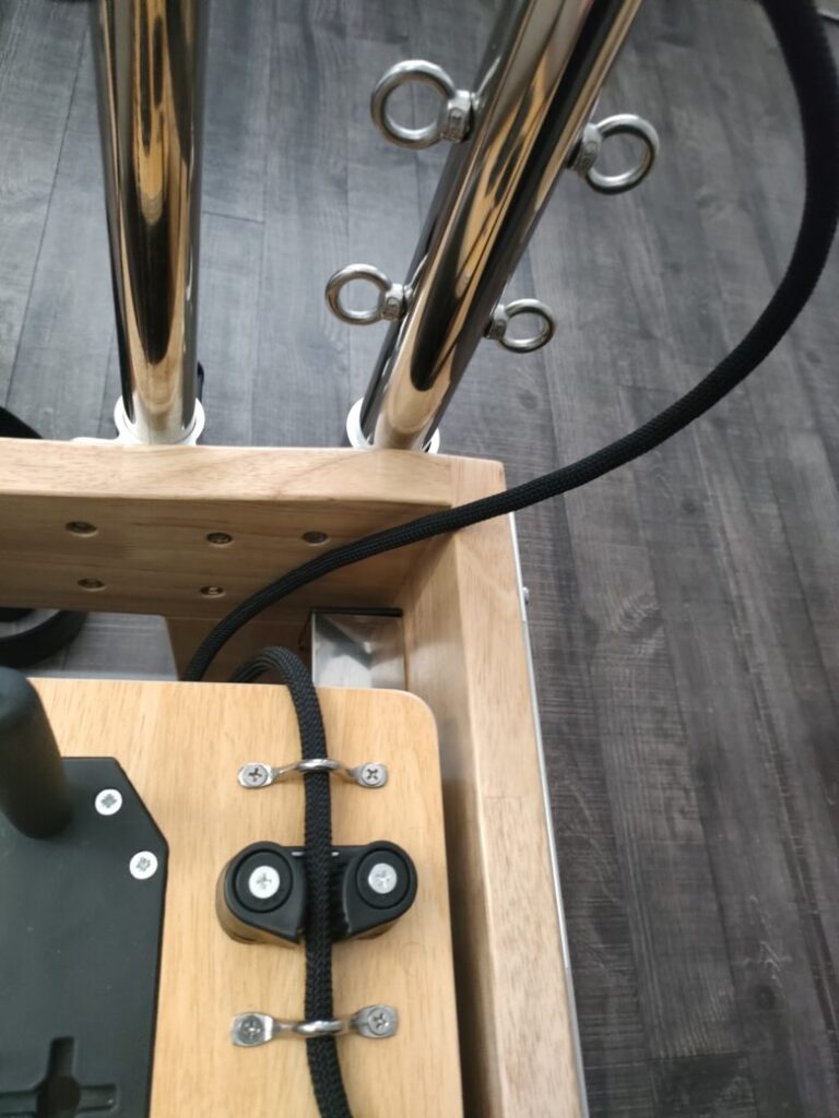④プーリーライザーを一番下の高さにし、プーリーが内側を向くようにセットする。ループや余ったコードは邪魔にならないように頭側の下に置いておく。